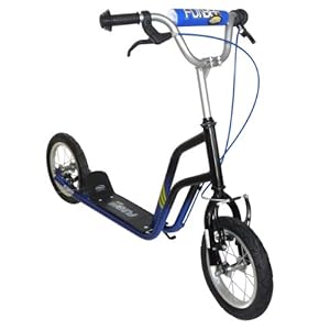 La patinette Funbee Cross possède des freins au guidon, une béquille et des roues cross gonflables.